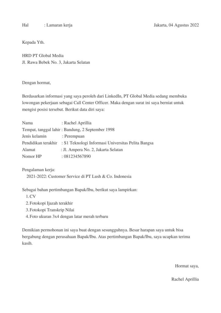 Berikut adalah beberapa contoh surat lamaran kerja yang sederhana namun sangat efektif: